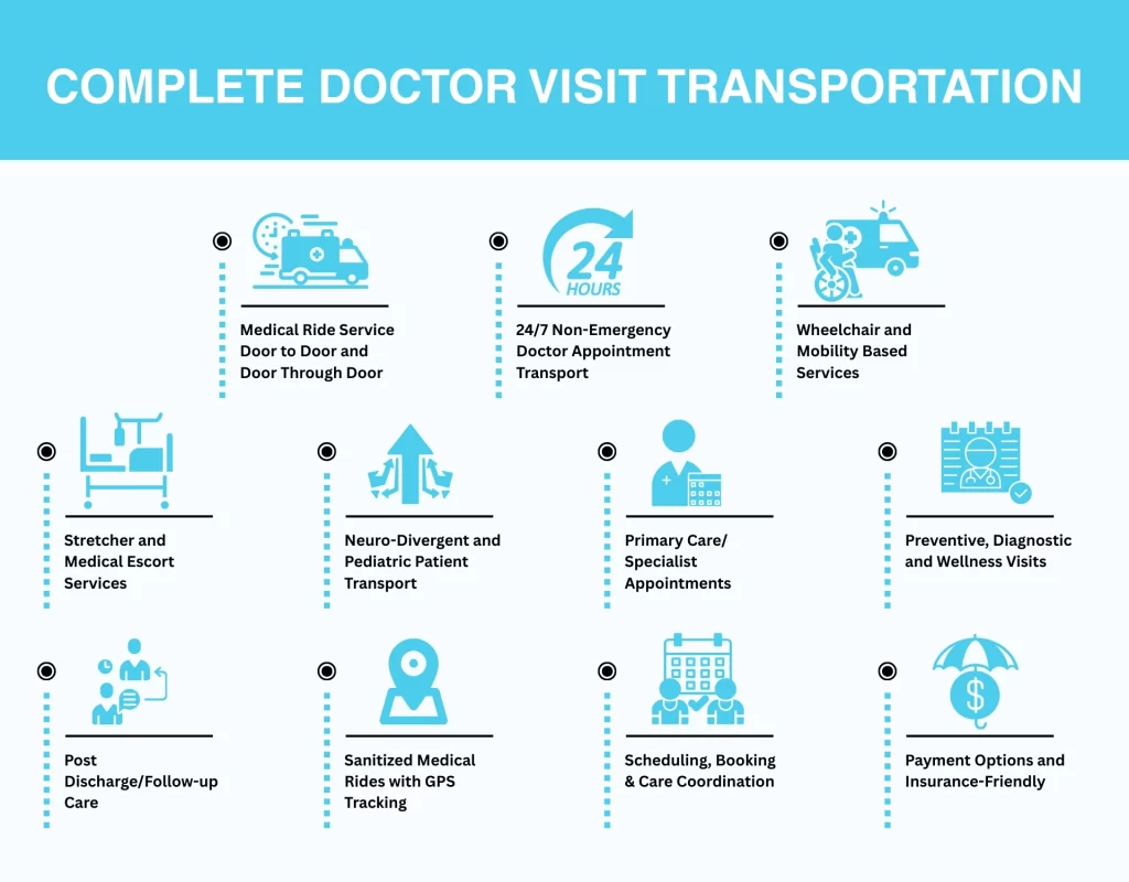 Access to an appointment with a doctor should not be a barrier to care. At Infina Health we offer reliable, accessible, patient centered transportation of doctor visits. Our service is efficient to make sure patients are safely, comfortably and on time at their destinations because it may be a regular check-up, a specialist appointment, a follow up visit, or transportation after the discharge of the hospitals to the physicians.