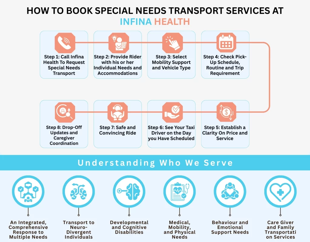 Families, support organizations, and caregivers can depend on transportation that knows the special needs of neuro-divergent persons, elderly with cognitive decline, children with developmental disabilities and adults with long-term medical conditions. At Infina Health, special needs transport program has been developed under one principle: all riders should feel respected, predictable and have a relaxing time. In contrast to general NEMT services, specialized mobility services of neuro-divergent and special needs individuals need a clear grasp of sensory sensitivities, behavioral stimuli, medical issues, mobility limitations, and the necessity of collaborating with caregivers.